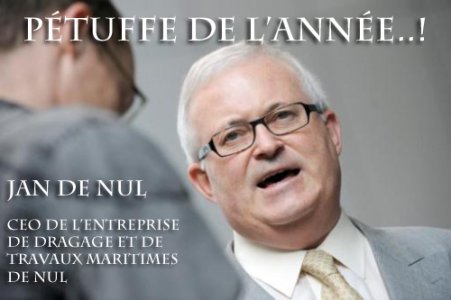 Bon, pour ne rien vous cacher, j’étais parti pour élire la zombie maléfique Annemie Turtelboom pour… "l’ensemble de son œuvre", puis je suis tombé sur cet article du Trends-Tendances et ce mec, Jan De Nul, ce fut le coup de foudre ! Ce type est un… pff, je vous laisse le choix des mots. En tout-cas, il a mérité haut-la-main son titre de pétuffe de l’année !