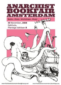 For more information, check out the website ! The program has yet to be confirmed, but some of the stands will be done by AFA Nederland, Anarchische Groep Amsterdam, ASEED, Atalanta, Autonomen Brabant, Anarchistische Boekwinkel Opstand,Paper Jam Print Collectief, Spreekuur89, Boek-Café De Barricade and Vrije Bond.