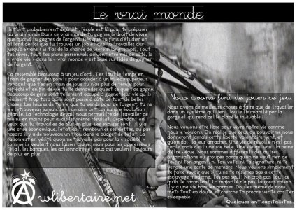 Nous sommes différents des autres organisations ou groupes parce qu’on ne veut rien de toi : ni ton argent, ni ton vote, ni ta signature, ni te vendre une carte de membre. Nous voulons simplement te faire savoir que si tu ne te résignes pas à cette esclavage moderne, t’es pas seul !