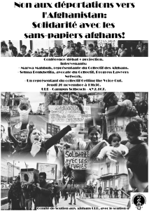 CE soir à l’ULB, venez nombreux ! Conférence-débat sur la lutte menée actuellement par le collectif des Afghans sans-papiers à Bruxelles. Seront présents :- Marwa Mahbub (porte-parole du collectif) pour nous partager son vécu dans cette lutte infatigable - Selma Benkhelifa (Avocate pour Progress lawyer) qui viendra nous éclaircir d’un point de vue juridique et politique sur la situation actuelle des Afghans et sur la question plus globale des sans-papiers- Getting the Voice Out, qui élargira la question en s’axant sur l’aspect répressif des politiques migratoires et les centres fermés Voici l’événement Facebook, il n’est pas trop tard pour le diffuser parmi vos amis d’ici demain soir :-)https://www.facebook.com/events/1377536225826904/?notif_t=plan_user_joined (Remarque : erreur de date dans l’affiche)