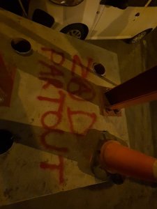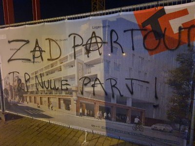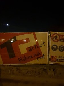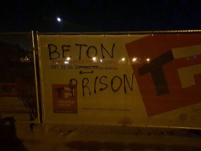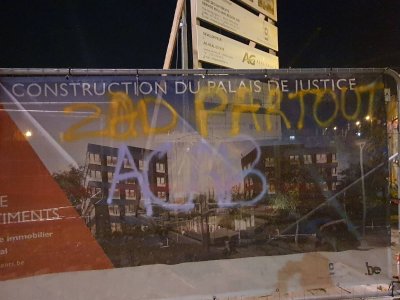 Jeudi 25 mars, 10 jours après l’expulsion lâche de la ZAD d’Arlon, des ombres ont laissé des messages sur les bâches du chantier du futur palais de justice de Namur (un autre de nos ennemis).